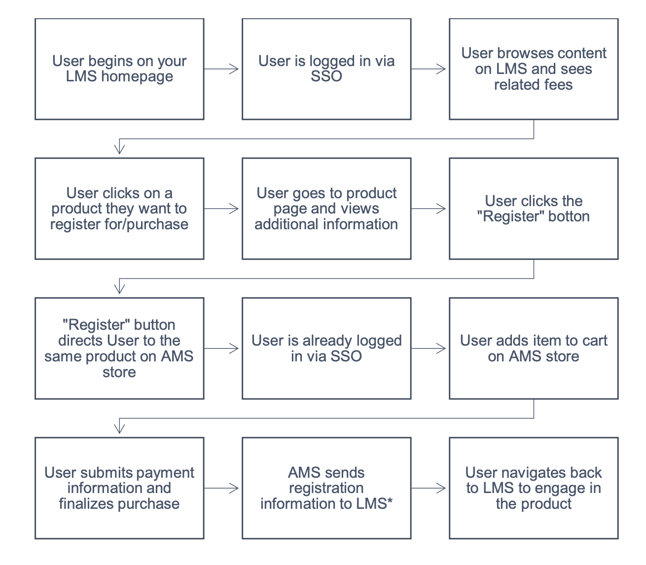 User browses and purchases on AMS store and after, then brought to Elevate LMS for engagement.