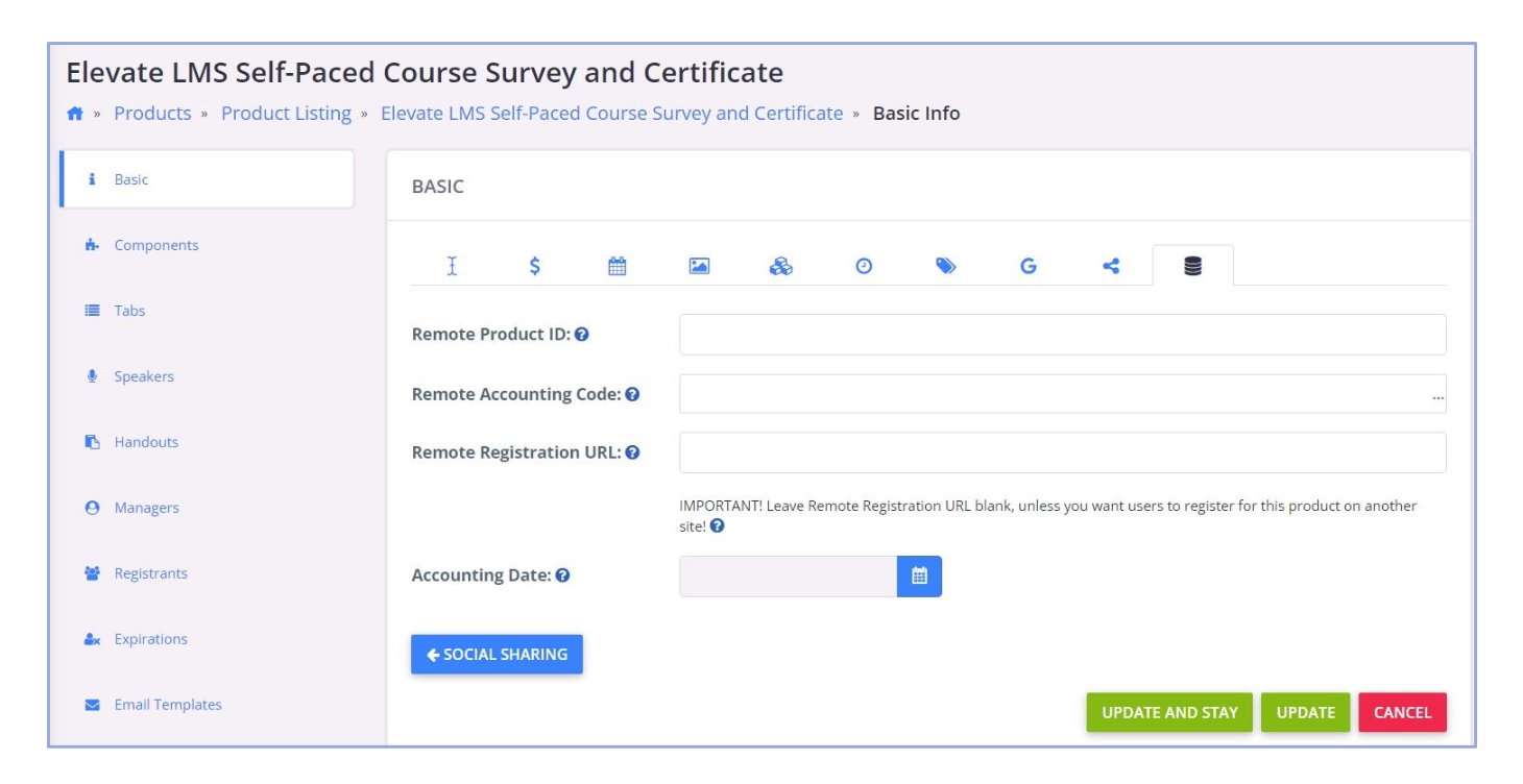 While the setup of Registration API happens mainly within your AMS, you need to connect all products that are for sale on your Elevate LMS to their corresponding products on your AMS store. To do this, use the Remote Product ID field to specify the ID of the product from the AMS store. To find the ID of the item on your AMS store, please refer to them for assistance.